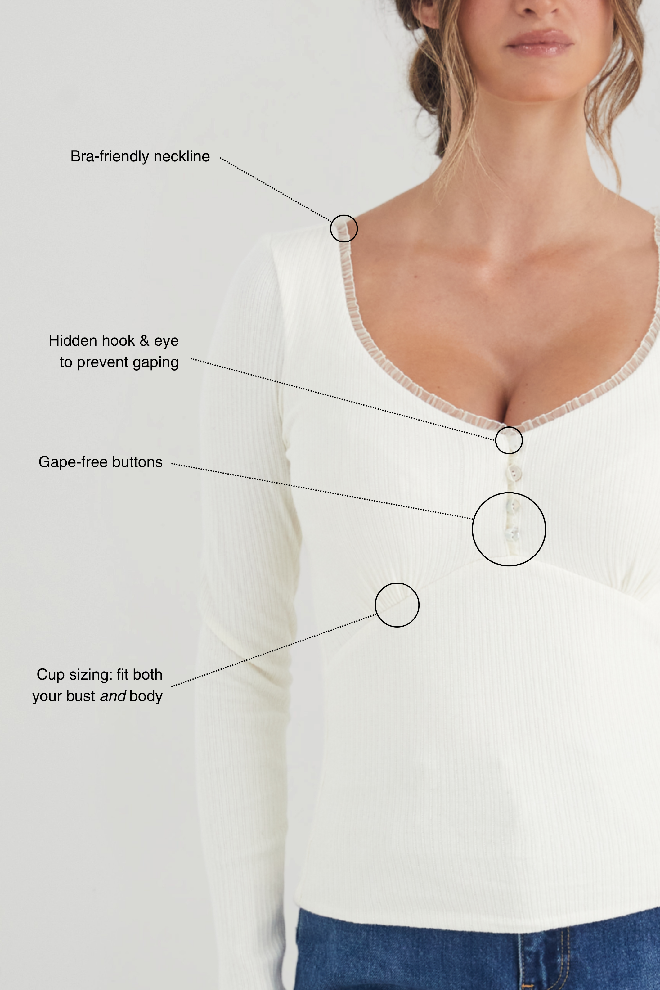 Alice is constructed from buttery ribbed fabric for a feather-weight jumper feeling. Packed with feminine details that reward a closer look - and of course, cut for fuller busts.