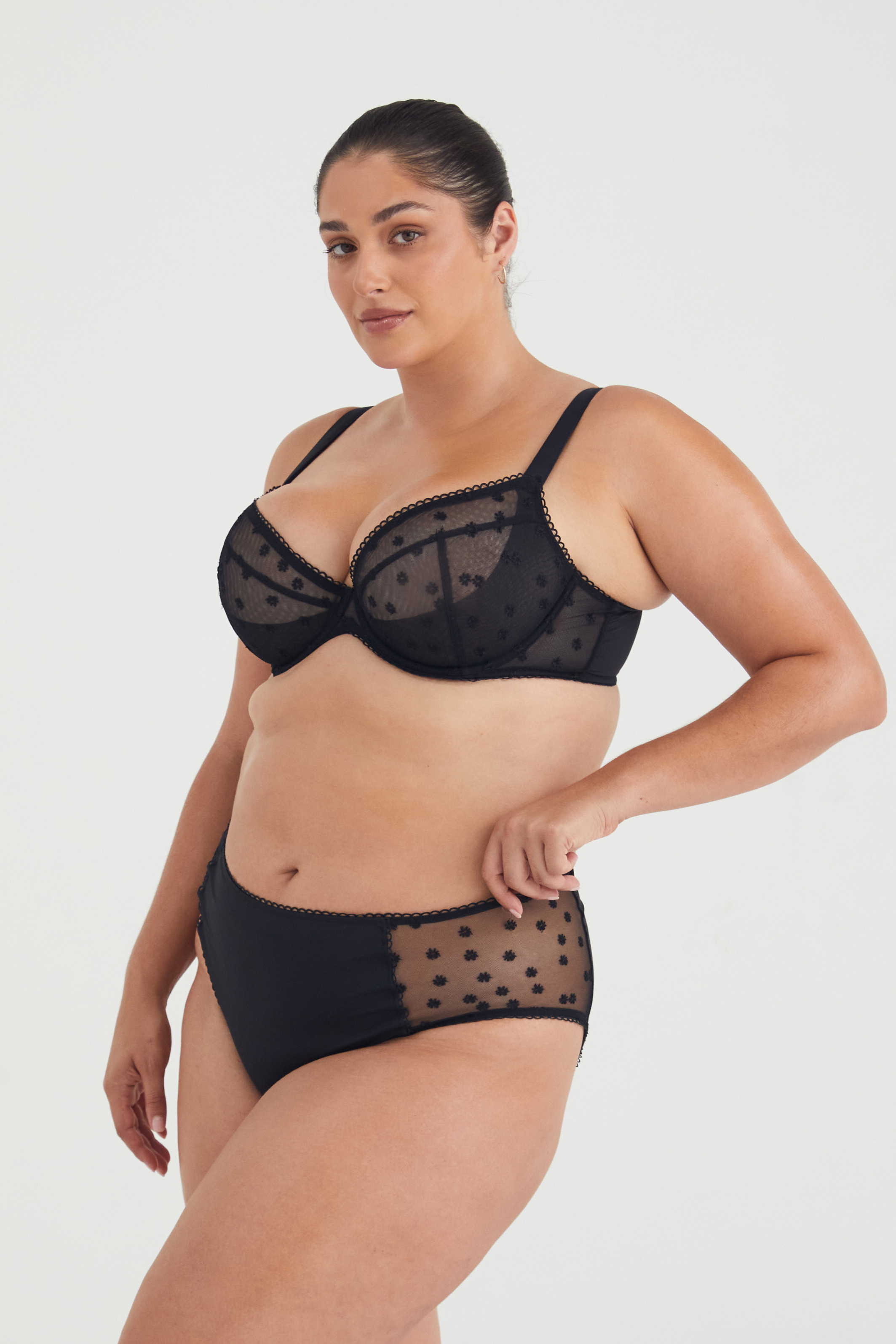 Your comfy everyday undies can also be your cute undies. The Juni Brief is a vintage-inspired style with a high rise, moderate coverage across the bum, sheer mesh side panels, and buttery microfibre construction. Pair it with the Juni bra for an everyday lingerie set that feels as good as it looks!
